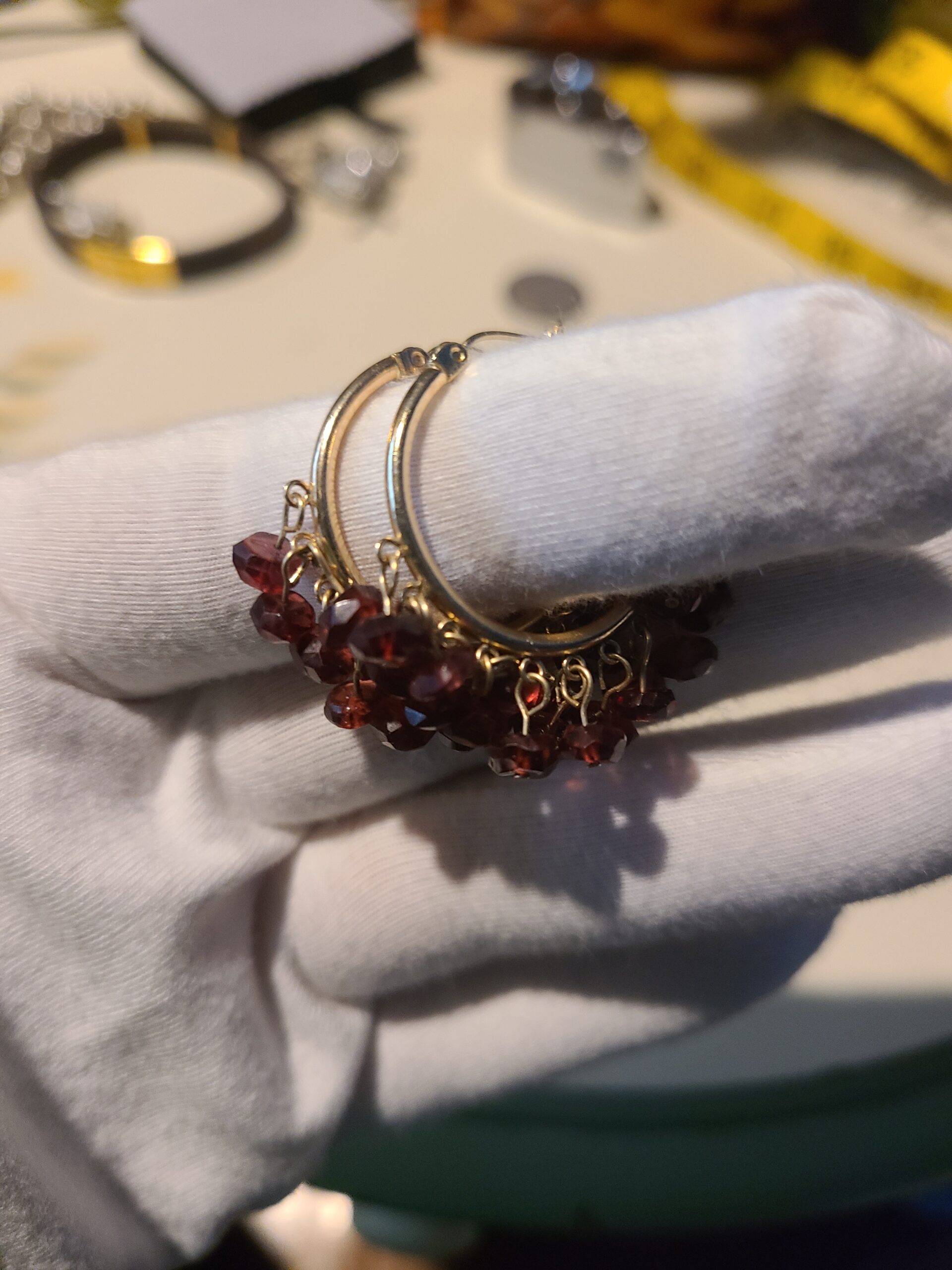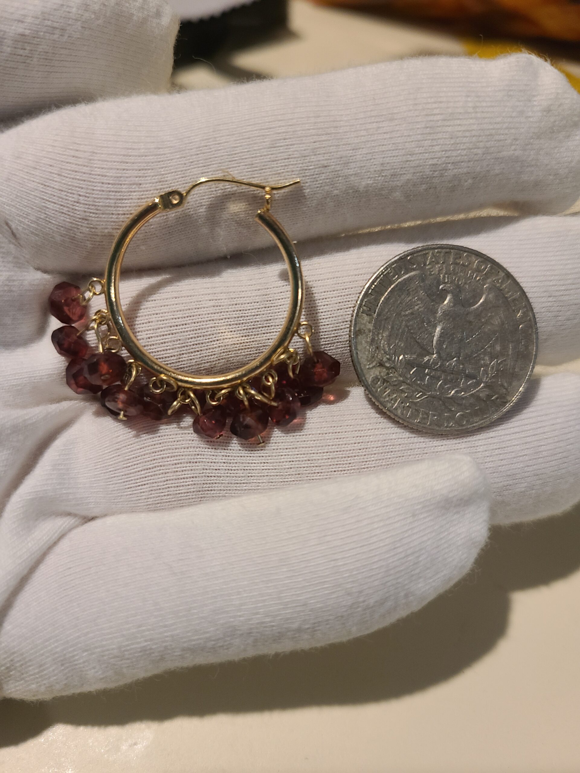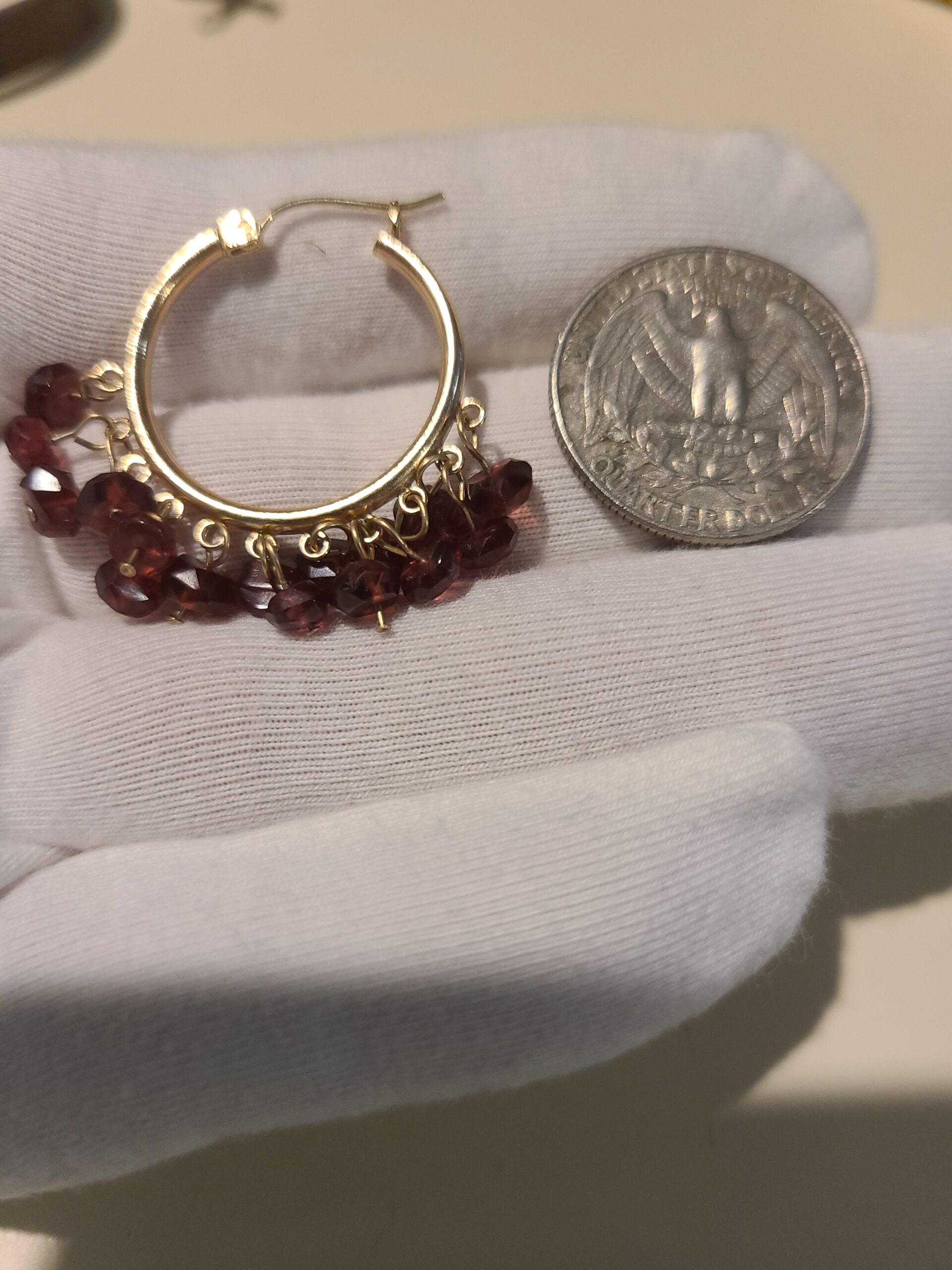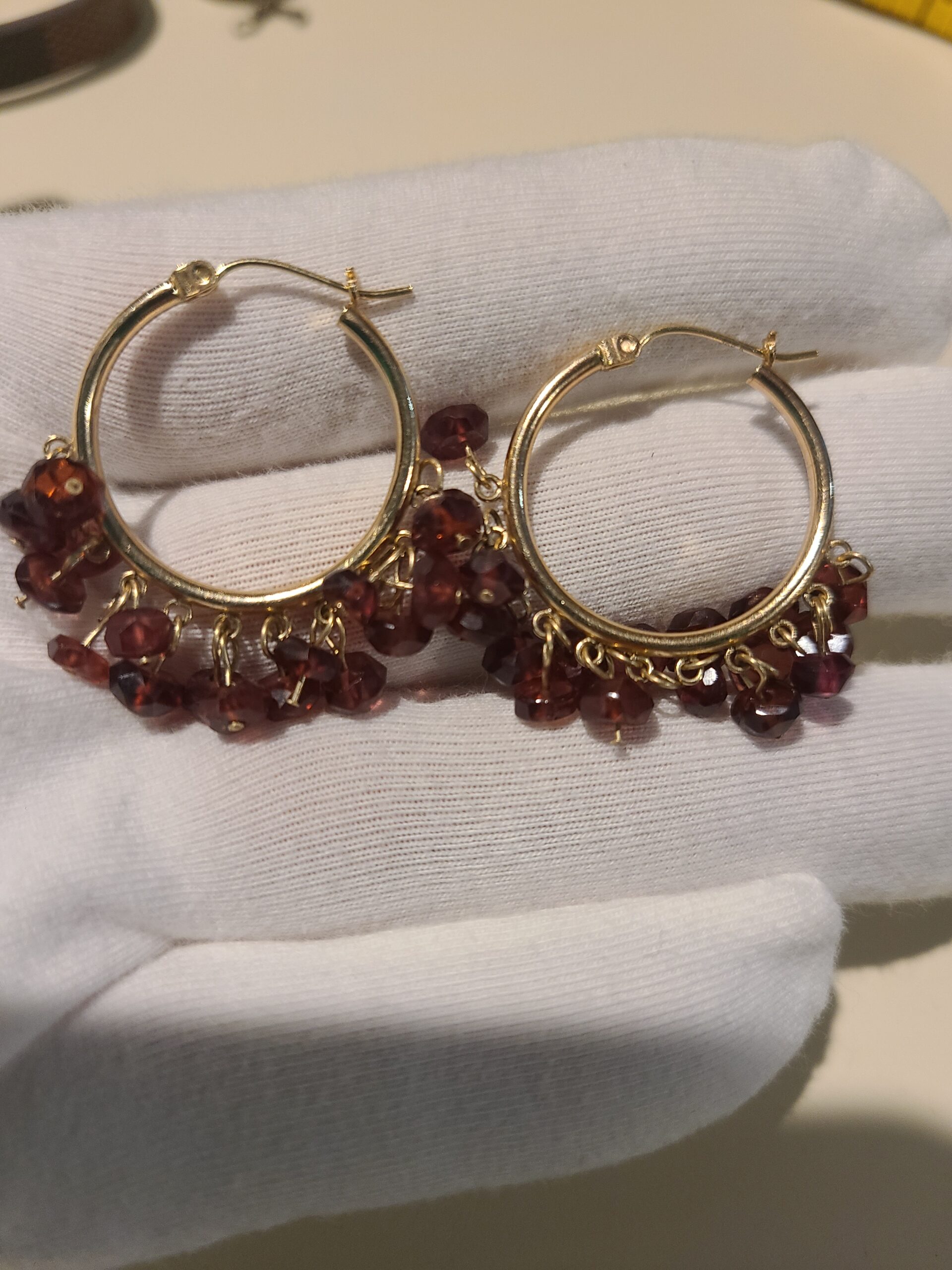 Beautiful 10k gold hoops with red gemstone beads, they are 1″ in length, gemstones are reddish in color. price is firm. They are 7.78 grams; they are in like new condition.